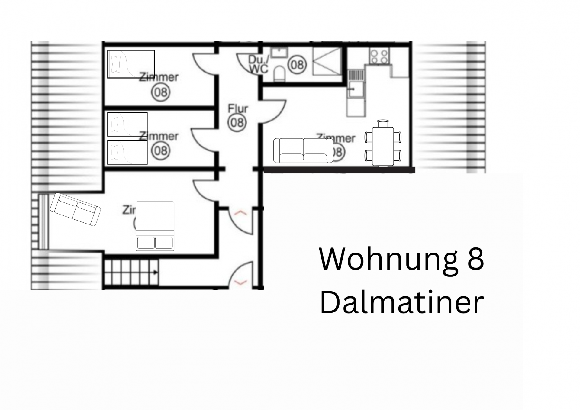 Unser charmantes Apartment "Dalmatiner" mit ca. 65 m² befindet sich im 1. OG des Hauses und bietet Komfort für bis zu 5 Personen.